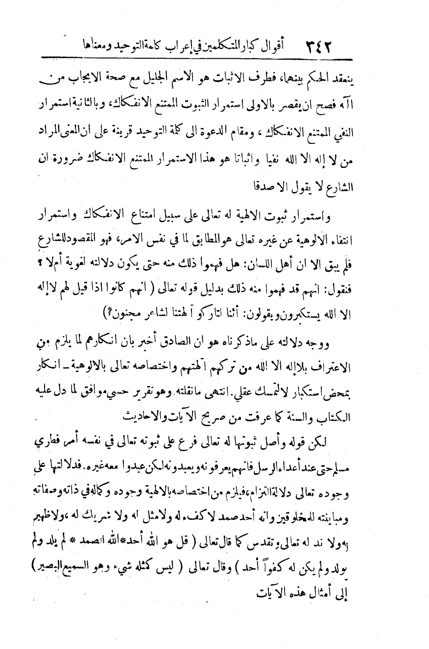 ينعقد الحكم بينهما، فطرف الإثبات هو الاسم الجليل مع صحة الإيجاب من إله، فصح أن يقصر بالأولى استمرار الثبوت الممتنع الانفكاك، وبالثانية استمرار النفي الممتنع الانفكاك، ومقام الدعوة إلى كلمة التوحيد قرينة على أن المعنى المراد من لا إله إلا الله نفيا وإثباتا هو هذا الاستمرار الممتنع الانفكاك ضرورة أن الشارع لا يقول إلا صدقا، واستمرار ثبوت الإلهية له -تعالى- على سبيل امتناع الانفكاك واستمرار انتفاء الألوهية عن غيره -تعالى- هو المطابق لما في نفس الأمر، فهو المقصود للشارع فلم يبق إلا أن أهل اللسان: هل فهموا ذلك منه حتى يكون دلالته لغوية أم لا؟