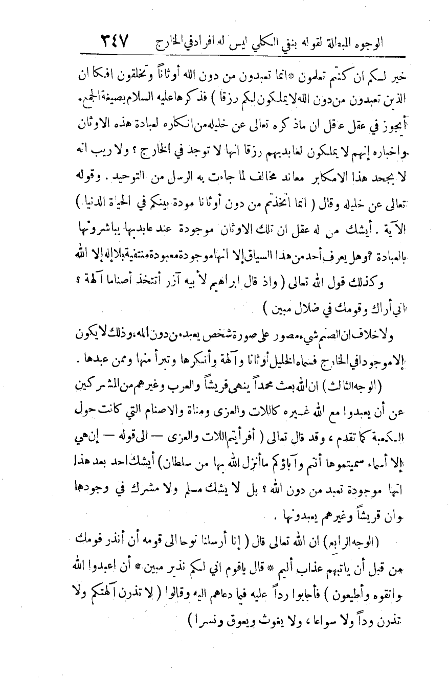 (الوجه الثالث): أن الله بعث محمدا ينهى قريشا والعرب وغيرهم من المشركين عن أن يعبدوا مع الله غيره كاللات والعُزى ومناة والأصنام التي كانت حول الكعبة كما تقدم، وقد قال تعالى: {أَفَرَأَيْتُمُ اللَّاتَ وَالْعُزَّى} 4 إلى قوله: {إِنْ هِيَ إِلَّا أَسْمَاءٌ سَمَّيْتُمُوهَا أَنْتُمْ وَآبَاؤُكُمْ مَا أَنْزَلَ اللَّهُ بِهَا مِنْ سُلْطَانٍ} 5. أيشك أحد بعد هذا أنها موجودة تعبد من دون الله؟ بل لا يشك مسلم ولا مشرك في وجودها وأن قريشا وغيرهم يعبدونها.