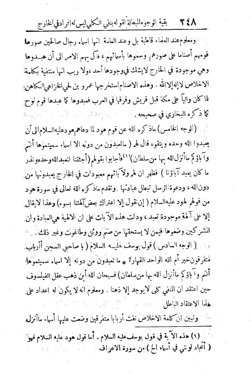 (الوجه السادس) قول يوسف عليه السلام: {يَا صَاحِبَيِ السِّجْنِ أَأَرْبَابٌ مُتَفَرِّقُونَ خَيْرٌ أَمِ اللَّهُ الْوَاحِدُ الْقَهَّارُ مَا تَعْبُدُونَ مِنْ دُونِهِ إِلَّا أَسْمَاءً سَمَّيْتُمُوهَا أَنْتُمْ وَآبَاؤُكُمْ مَا أَنْزَلَ اللَّهُ بِهَا مِنْ سُلْطَانٍ} 5. فسبحان الله أين ذهب عقل الفيلسوف حين اعتقد أن المنفي كلي لا يوجد إلا ذهنا؟!