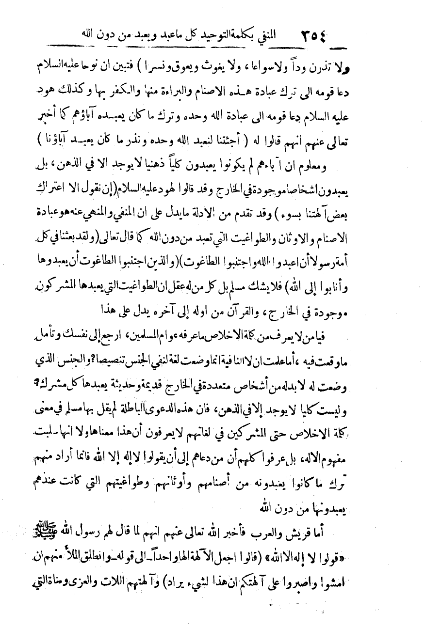 فيا من لا يعرف من كلمة الإخلاص ما عرفه عوام المسلمين! ارجع إلى نفسك، وتأمل ما وقعت فيه، أما علمت أن لا النافية إنما وضعت لغة لنفي الجنس تنصيصا؟ والجنس الذي وضعت له لا بد له من أشخاص متعددة في الخارج، قديمة وحديثة، يعبدها كل مشرك؟ وليست كليا لا يوجد إلا في الذهن؟
