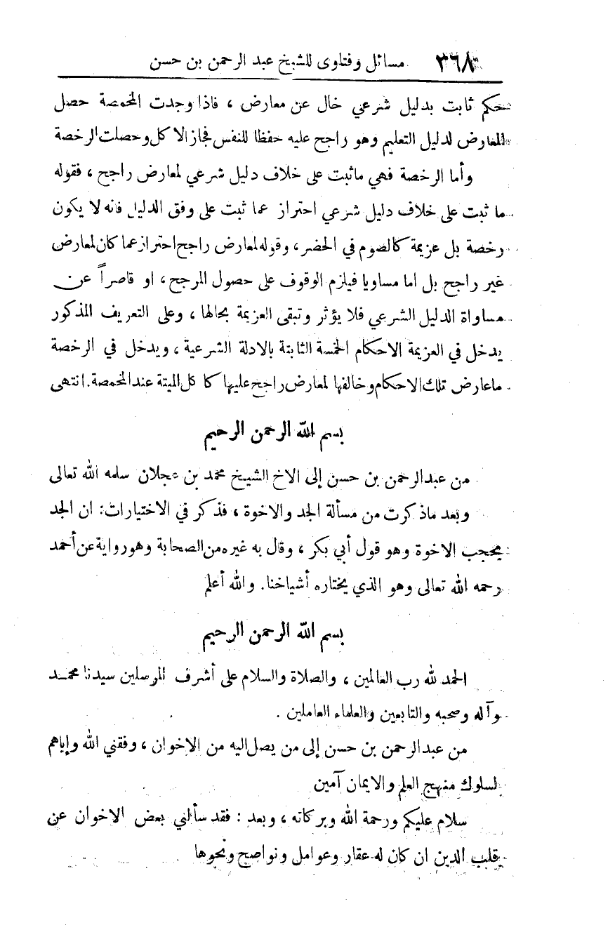 من عبد الرحمن بن حسن إلى من يصل إليه من الإخوان، وفقني الله وإياهم لسلوك منهج العلم والإيمان. آمين.