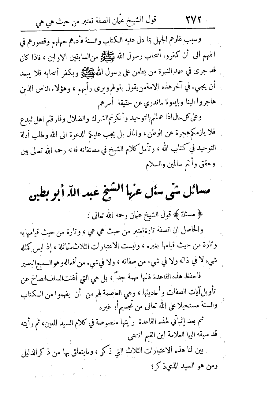 مسألة: قول الشيخ عثمان -رحمه الله تعالى-: والحاصل أن الصفة تارة تعتبر من حيث هي هي، وتارة من حيث قيامها به، وتارة من حيث قيامها بغيره، وليست الاعتبارات الثلاث متماثلة، إذ {لَيْسَ كَمِثْلِهِ شَيْءٌ} 1 لا في ذاته، ولا في شيء من صفاته، ولا في شيء من أفعاله، {وَهُوَ السَّمِيعُ الْبَصِيرُ} 2.
