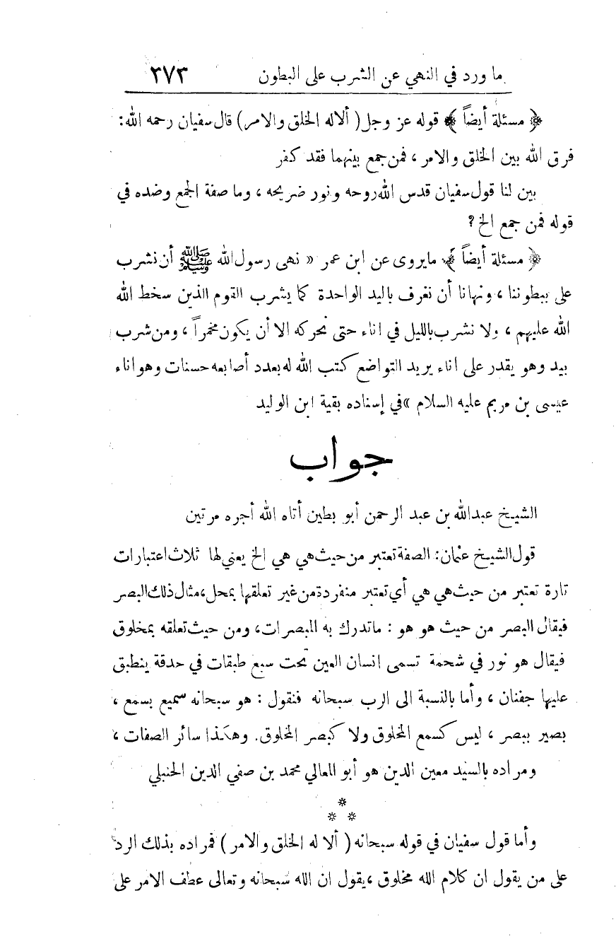 وأما قول سفيان في قوله -سبحانه-: {أَلا لَهُ الْخَلْقُ وَالأَمْرُ} 4، فمراده بذلك الرد على من يقول: إن كلام الله مخلوق. يقول: إن الله -سبحانه وتعالى- عطف الأمر على