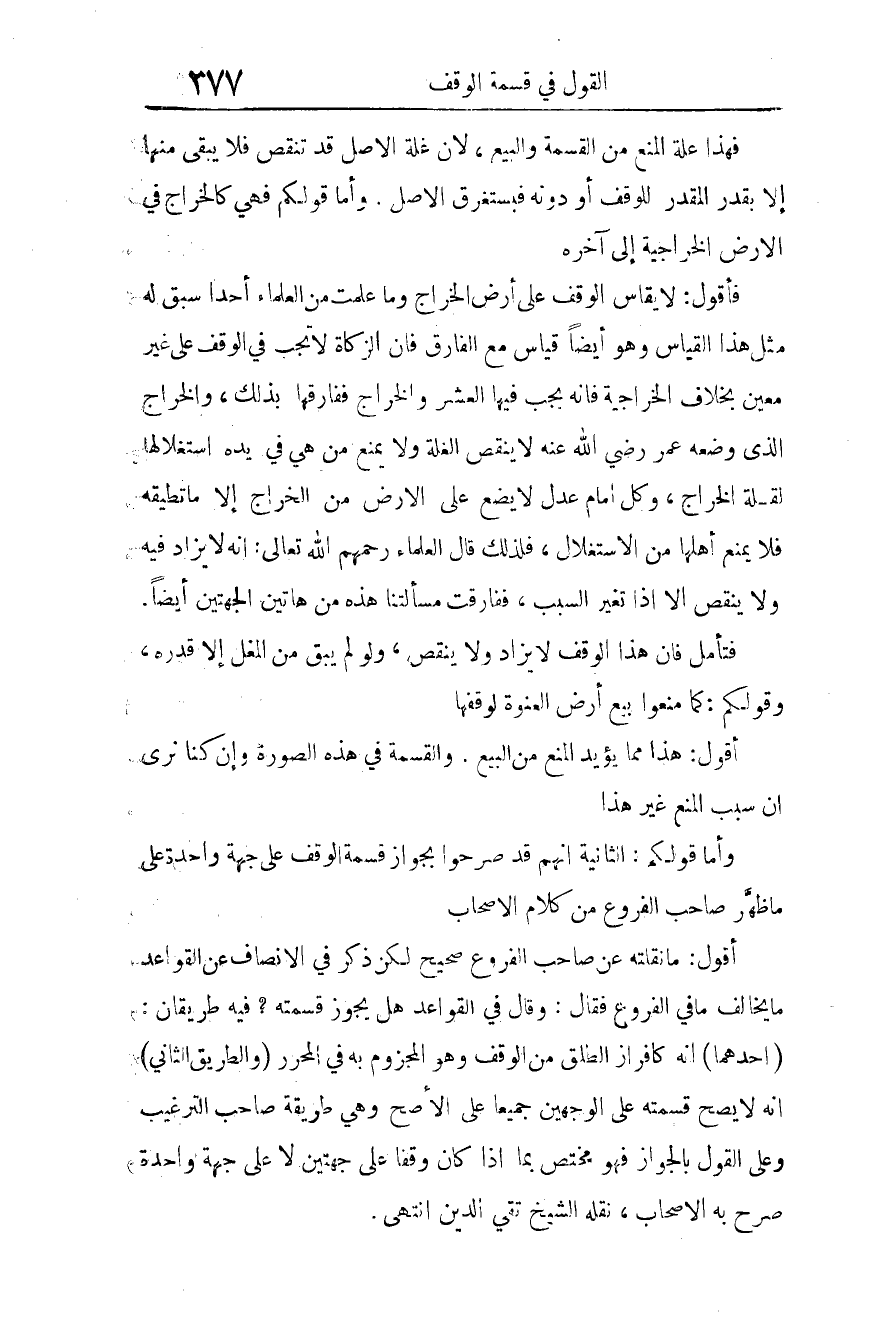 وأما قولكم: الثانية: أنهم قد صرَّحوا بجواز قسمة الوقف على جهة واحدة على ما ظهر صاحب الفروع من كلام الأصحاب.
