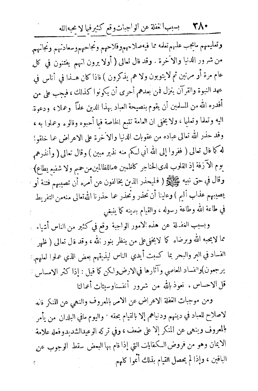 وقد قال -تعالى-: {أَوَلا يَرَوْنَ أَنَّهُمْ يُفْتَنُونَ فِي كُلِّ عَامٍ مَرَّةً أَوْ مَرَّتَيْنِ ثُمَّ لا يَتُوبُونَ وَلا هُمْ يَذَّكَّرُونَ} 1. فإذا كان هذا في أناس في عهد النبوة والقرآن ينْزل، فمَن بعدهم أحرى أن يكونوا كذلك، فيجب على من أقدره الله من المسلمين أن يقوم بنصيحة العباد بهذا الدين علما وعملا، ودعوة إليه وتعلما وتعليما، ولا يخفى أن العامة تتبع الخاصة فيما أحبوه وقالوه وعملوا به.