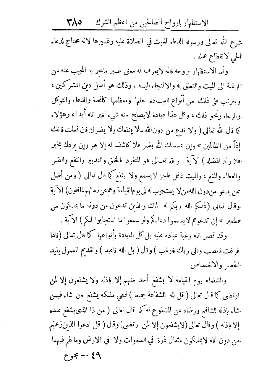 وأما الاستظهار بروحه فإنه لا يعرف له معنى غير ما عبر به المجيب عنه من الرغبة إلى الميت، والتعلق به، والالتجاء إليه، وذلك هو أصل دين المشركين، ويترتب على ذلك من أنواع العبادة جلها ومعظمها كالمحبة والدعاء والتوكل والرجاء ونحو ذلك، وكل هذا عبادة لا يصلح منه شيء لغير الله أبدا، وهؤلاء كما قال الله -تعالى-: {وَلا تَدْعُ مِنْ دُونِ اللَّهِ مَا لا يَنْفَعُكَ وَلا يَضُرُّكَ فَإِنْ فَعَلْتَ فَإِنَّكَ إِذًا مِنَ الظَّالِمِينَوَإِنْ يَمْسَسْكَ اللَّهُ بِضُرٍّ فَلا كَاشِفَ لَهُ إِلَّا هُوَ وَإِنْ يُرِدْكَ بِخَيْرٍ فَلا رَادَّ لِفَضْلِهِ} 1 الآية.