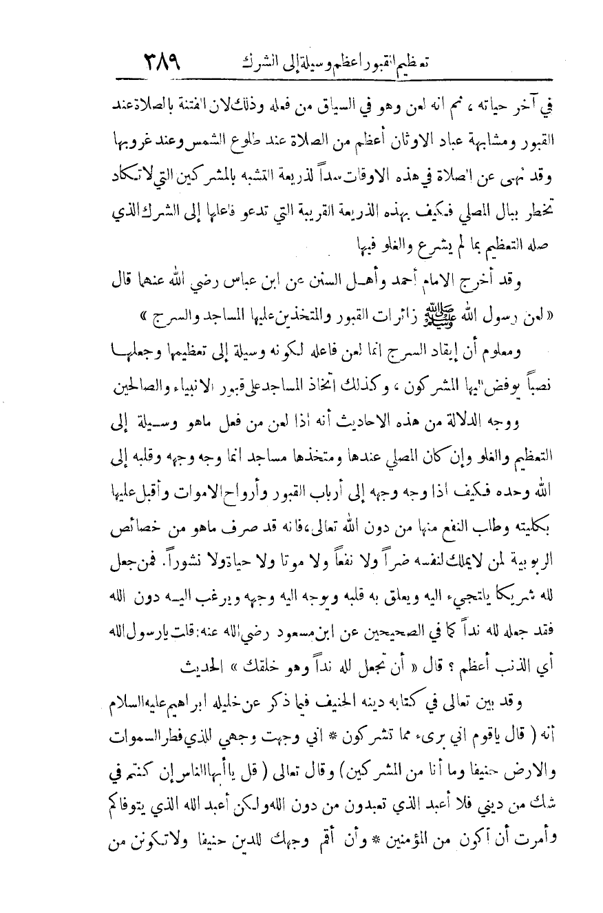 ووجه الدلالة من هذه الأحاديث أنه إذا لعن من فعل ما هو وسيلة إلى التعظيم والغلو، وإن كان المصلي عندها ومتخذها مساجد إنما وجه وجهه وقلبه إلى الله وحده، فكيف إذا وجه وجهه إلى أرباب القبور، وأرواح الأموات، وأقبل عليها بكليته، وطلب النفع منها من دون الله -تعالى-؟ فإنه قد صرف ما هو من خصائص الربوبية لمن لا يملك لنفسه ضرا ولا نفعا، ولا موتا ولا حياة ولا نشورا.
