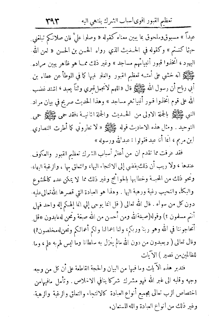 فقد عرفت مما تقدم أن من أعظم أسباب الشرك تعظيم القبور والعكوف عندها، ولا ريب أن ذلك يفضي إلى الالتجاء إليها، والتعلق بها، والرغبة إليها؛ ونحو ذلك من المحبة، وخطابها بالحوائج، وغير ذلك مما لا يمكن عده كالخشوع، والبكاء والنحيب رغبة ورهبة إليها. وهذا هو العبادة التي قصرها الله -تعالى- عليه دون كل من سواه.