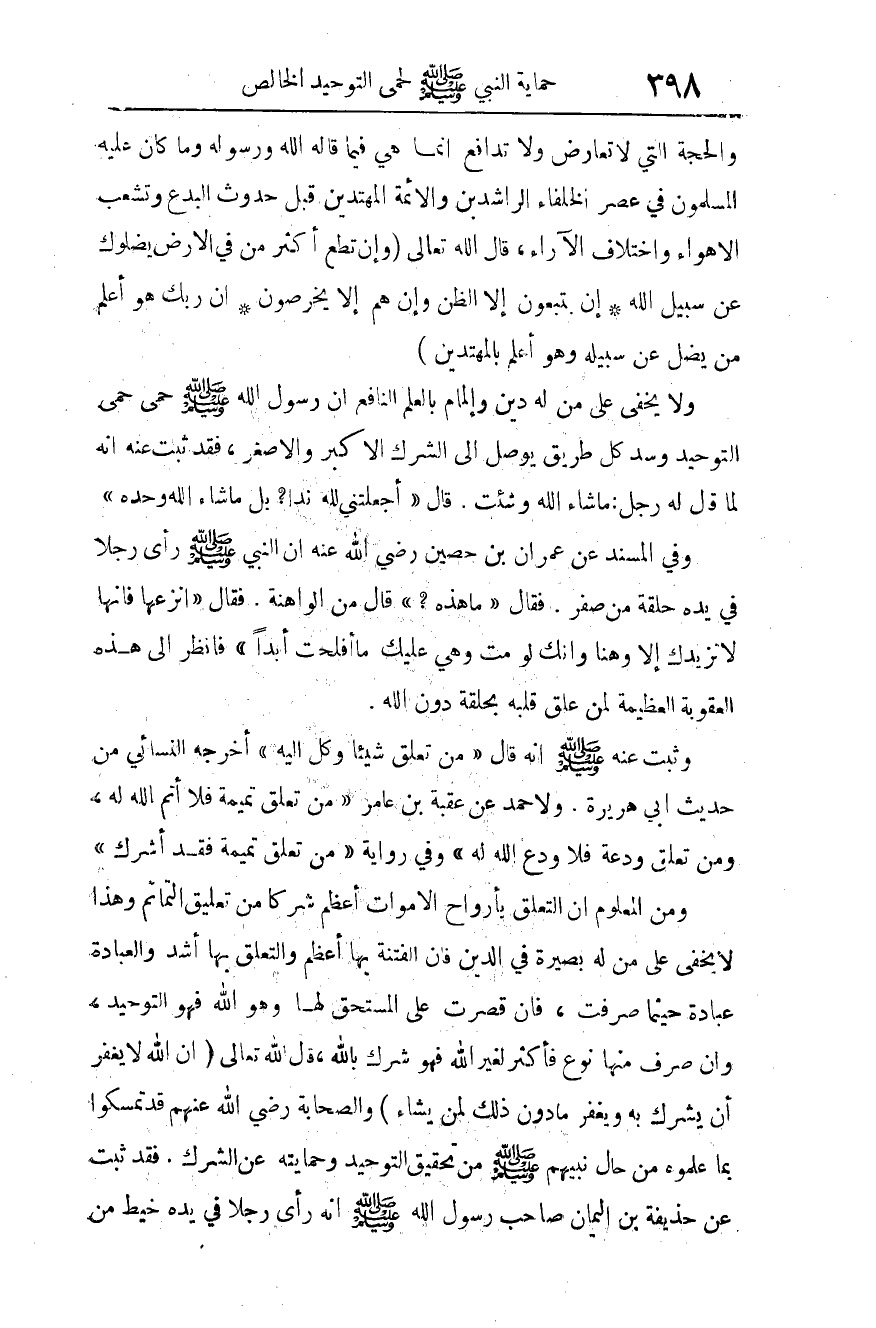 وثبت عنه صلى الله عليه وسلم أنه قال: "من تعلق شيئا وكل إليه"4 أخرجه النسائي من حديث أبي هريرة. ولأحمد عن عقبة بن عامر: "من تعلق تميمة فلا أتم الله له، ومن تعلق ودعة فلا ودع الله له"5، وفي رواية: "من تعلق تميمة فقد أشرك"6.