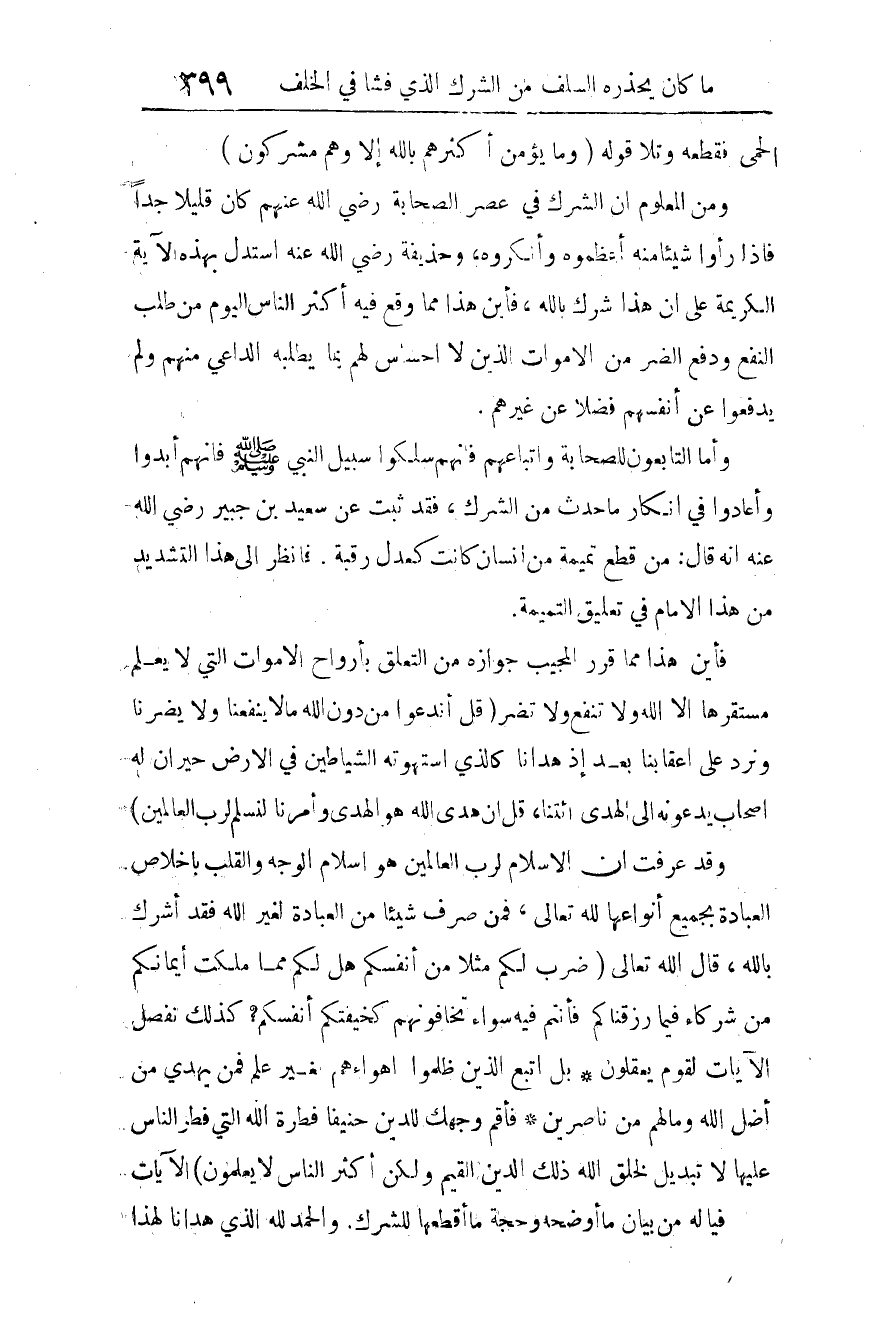 ومن المعلوم أن الشرك في عصر الصحابة -رضي الله عنهم- كان قليلا جدًّا، فإذا رأوا شيئا منه أعظموه وأنكروه. وحذيفة رضي الله عنه استدل بهذه الآية الكريمة على أن هذا شرك بالله، فأين هذا مما وقع فيه أكثر الناس اليوم من طلب النفع ودفع الضر من الأموات، الذين لا إحساس لهم بما يطلبه الداعي منهم، ولم يدفعوا عن أنفسهم فضلا عن غيرهم؟!