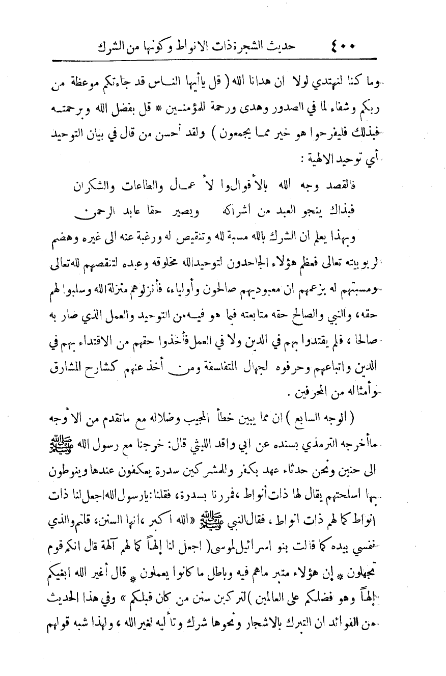 "خرجنا مع رسول الله صلى الله عليه وسلم إلى حنين، ونحن حدثاء عهد بكفر، وللمشركين سدرة يعكفون عندها، وينوطون بها أسلحتهم، يقال لها: ذات أنواط. فمررنا بسدرة، فقلنا: يا رسول الله، اجعل لنا ذات أنواط كما لهم ذات أنواط، فقال النبي صلى الله عليه وسلم: الله أكبر، إنها السنن، قلتم والذي نفسي بيده كما قالت بنو إسرائيل لموسى: {اجْعَلْ لَنَا إِلَهًا كَمَا لَهُمْ آلِهَةٌ قَالَ إِنَّكُمْ قَوْمٌ تَجْهَلُونَ إِنَّ هَؤُلاءِ مُتَبَّرٌ مَا هُمْ فِيهِ وَبَاطِلٌ مَا كَانُوا يَعْمَلُونَ قَالَ أَغَيْرَ اللَّهِ أَبْغِيكُمْ إِلَهًا وَهُوَ فَضَّلَكُمْ عَلَى الْعَالَمِينَ} لتركبن سنن من كان قبلكم".