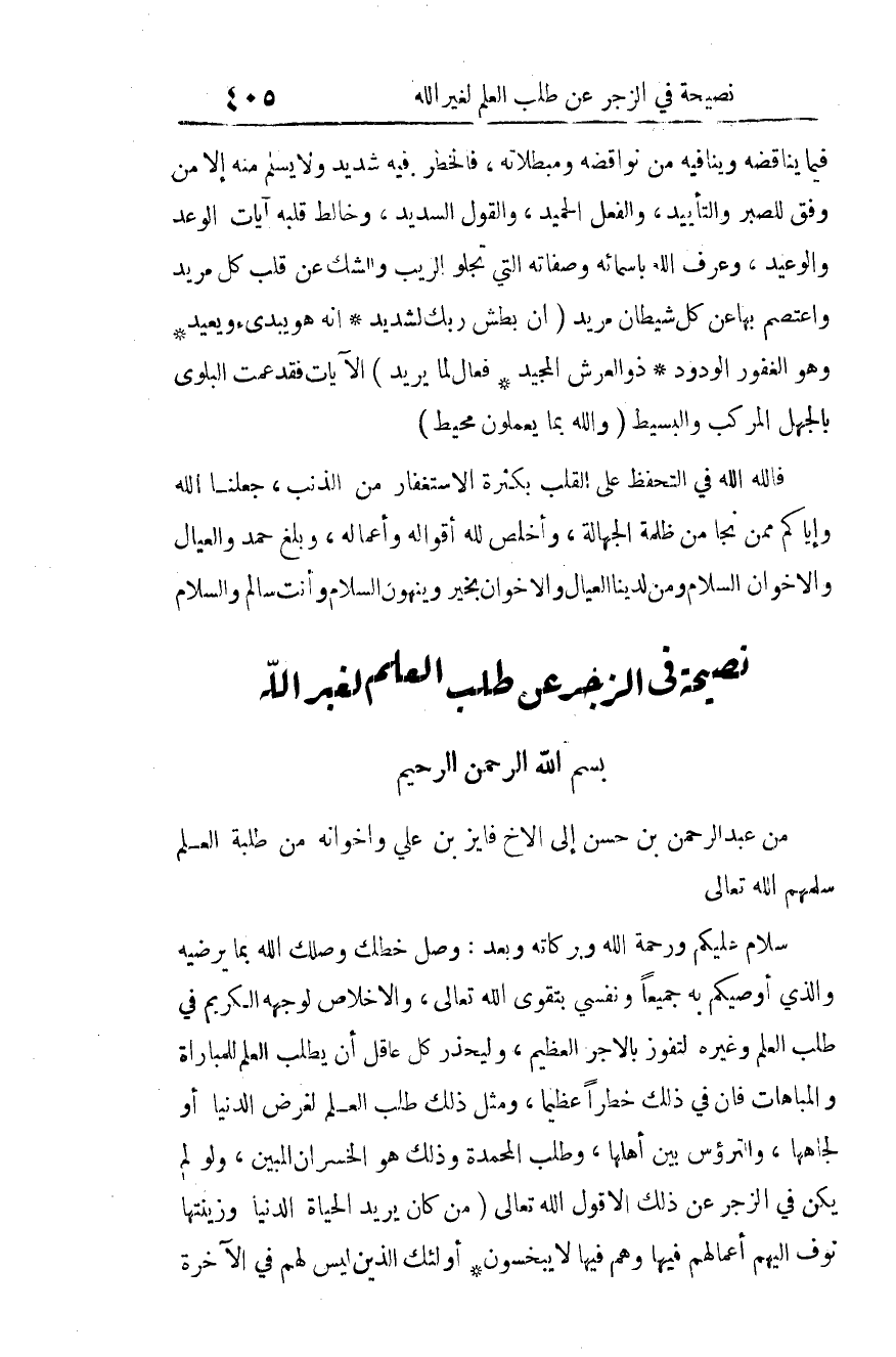 من عبد الرحمن بن حسن إلى الأخ فايز بن علي وإخوانه من طلبة العلم -سلمهم الله تعالى-.