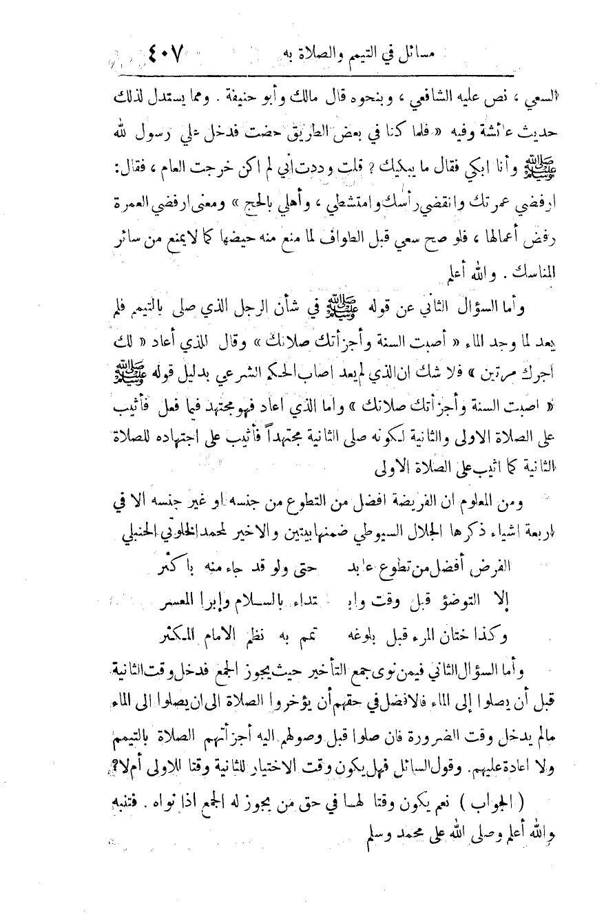 وأما السؤال الثالث: فيمن نوى جمع التأخير حيث يجوز الجمع، فدخل وقت الثانية قبل أن يصلوا إلى الماء، فالأفضل في حقهم أن يؤخروا الصلاة إلى أن يصلوا إلى الماء ما لم يدخل وقت الضرورة، فإن صلوا قبل وصولهم إليه أجزأتهم الصلاة بالتيمم، ولا إعادة عليهم.