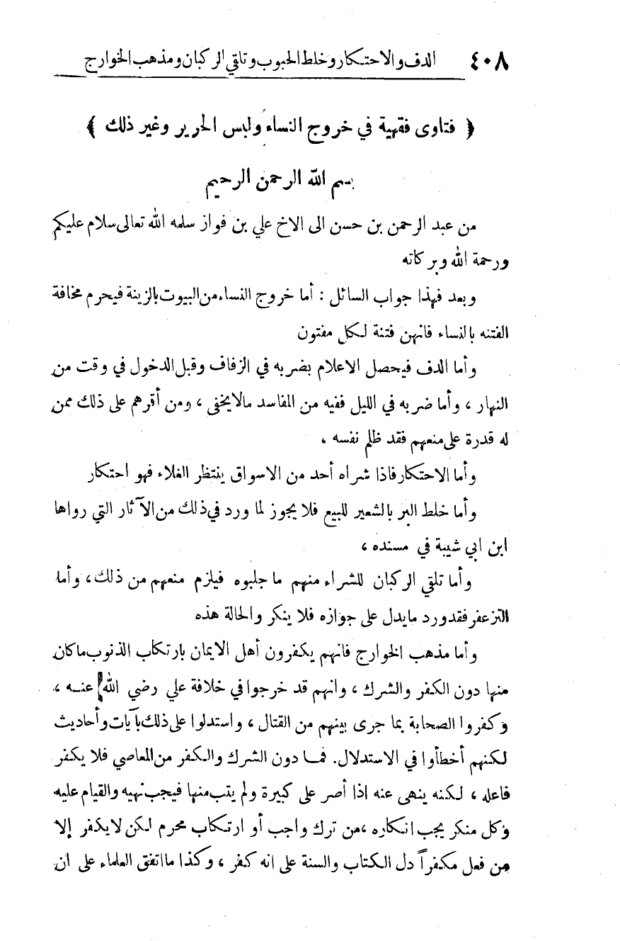 من عبد الرحمن بن حسن إلى الأخ علي بن فواز -سلمه الله تعالى-.