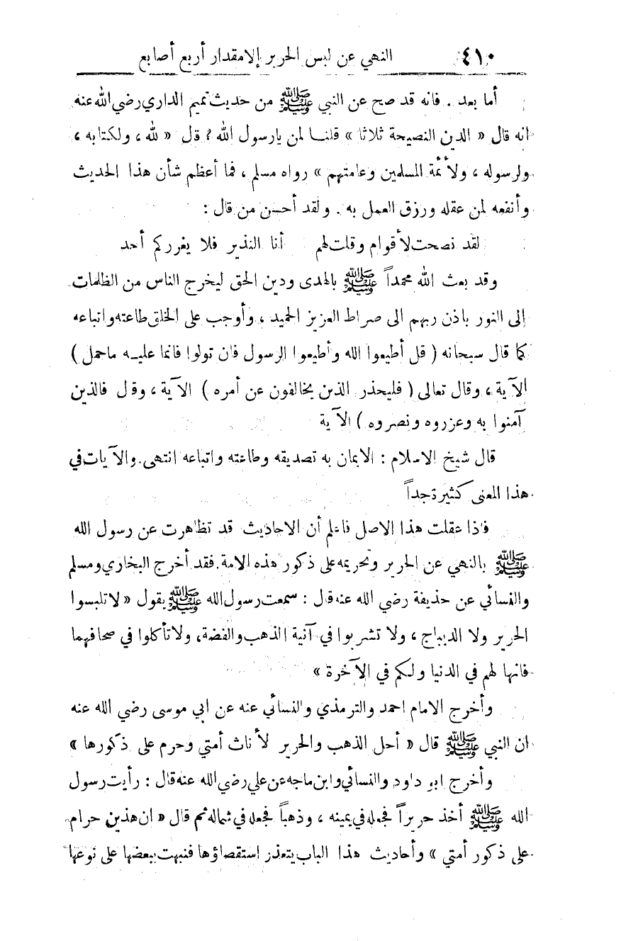 فإذا عقلت هذا الأصل، فاعلم أن الأحاديث قد تظاهرت عن رسول الله صلى الله عليه وسلم بالنهي عن الحرير وتحريمه على ذكور هذه الأمة، فقد أخرج البخاري ومسلم والنسائي عن حذيفة رضي الله عنه قال: "سمعت رسول الله صلى الله عليه وسلم يقول: لا تلبسوا الحرير ولا الديباج، ولا تشربوا في آنية الذهب والفضة، ولا تأكلوا في صحافهما، فإنها لهم في الدنيا ولكم في الآخرة"5.