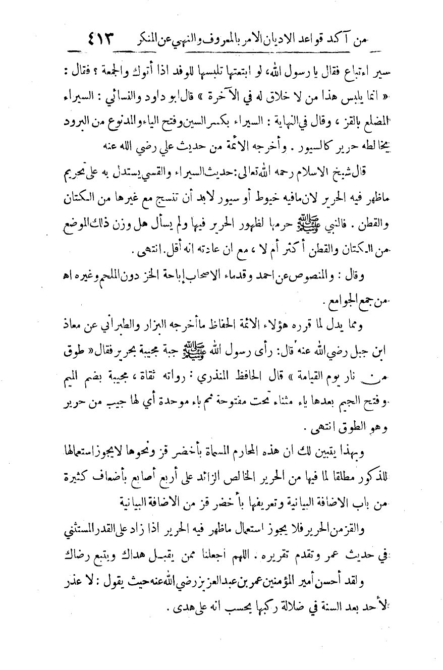 ومما يدل لما قرره هؤلاء الأئمة الحفاظ ما أخرجه البزار والطبراني عن معاذ بن جبل رضي الله عنه قال: "رأى رسول الله صلى الله عليه وسلم جبة مجيبة بحرير، فقال: طوق من نار يوم القيامة" قال الحافظ المنذري: رواته ثقاة، مجيبة بضم الميم وفتح الجيم بعدها ياء مثناة تحت مفتوحة ثم باء موحدة أي: لها جيب من حرير، وهو الطوق. انتهى.