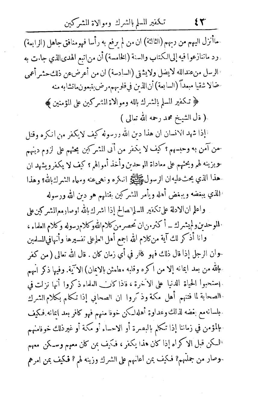 إذا شهد الإنسان أن هذا دين الله ورسوله؛ كيف لا يَكْفُرُ مَن أنكره، وَقَتَلَ مَنْ آمَنَ به وحَبَسَهُمْ؟ كيف لا يَكْفُرُ مَنْ أتَى المشركين يحثهم على لزوم دينهم، ويُزَيِّنه لهم، ويحثّهم على معاداة الموحدين وأخذ أموالهم؟ كيف لا يكفر؛ ويشهد أن هذا الذي يحث عليه أن الرسول صلى الله عليه وسلم أنكره، ونهى عنه وسماه الشرك بالله؟ وهذا الذي يبغضه ويبغض أهله ويأمر المشركين بقتلهم هو دين الله ورسوله.
