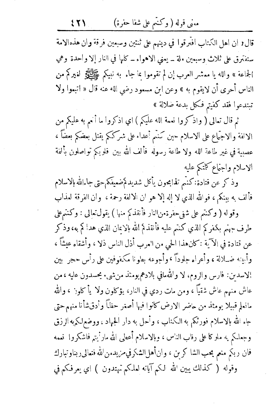 وقوله: {وَكُنْتُمْ عَلَى شَفَا حُفْرَةٍ مِنَ النَّارِ فَأَنْقَذَكُمْ مِنْهَا} 3 يقول تعالى: وكنتم على طرف جهنم بكفركم الذي كنتم عليه، فأنقذكم الله بالإيمان الذي هداكم به. وذكر عن قتادة في الآية: كان هذا الحي من العرب أذل الناس ذلا، وأشقاه عيشا، وأبينه ضلالة، وأعراه جلودا، وأجوعه بطونا، مكفوفين على رأس حجر بين الأسدين: فارس والروم. لا والله ما في بلادهم يومئذ من شيء يحسدون عليه. من عاش منهم عاش شقيا، ومن مات ردي في النار، يؤكلون ولا يأكلون. والله ما نعلم قبيلا يومئذ من حاضر الأرض كانوا فيها أصغر حظا، وأدق شأنا منهم. حتى جاء الله بالإسلام، فورثكم به الكتاب، وأحل به دار الجهاد، ووضع لكم به الرزق، وجعلكم به ملوكا على رقاب الناس، وبالإسلام أعطى الله ما رأيتم. فاشكروا نعمه فإن ربكم منعم يحب الشاكرين؛ وإن أهل الشكر في مزيد من الله، فتعالى ربنا وتبارك.