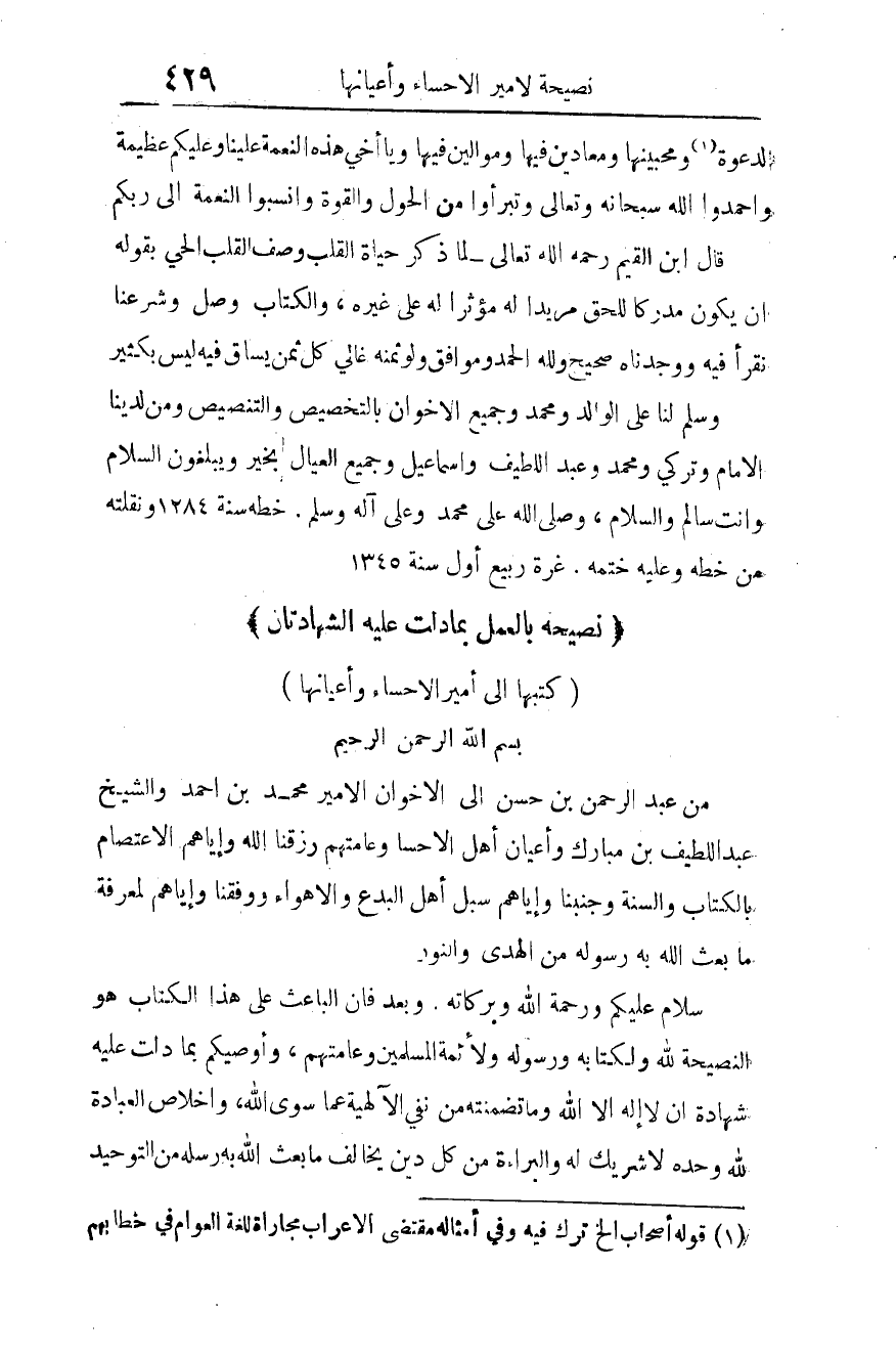 من عبد الرحمن بن حسن إلى الإخوان الأمير محمد بن أحمد والشيخ عبد اللطيف بن مبارك وأعيان أهل الأحساء، وعامتهم، رزقنا الله وإياهم الاعتصام بالكتاب والسنة، وجنبنا وإياهم سبل أهل البدع والأهواء، ووفقنا وإياهم لمعرفة ما بعث الله به رسوله من الهدى والنور.