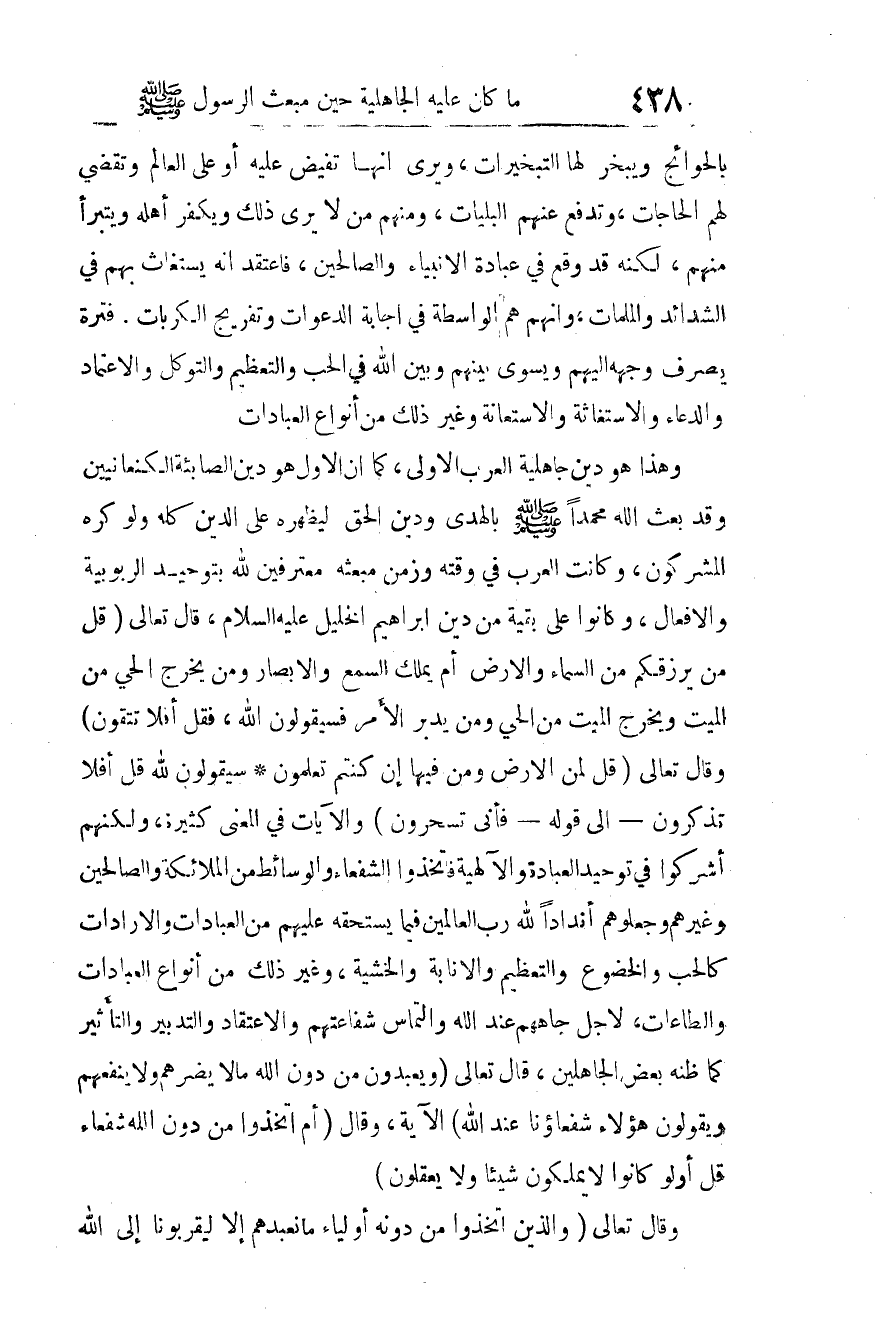 بالحوائج ويبخر لها التبخيرات، ويرى أنها تفيض عليه أو على العالم، وتقضي لهم الحاجات، وتدفع عنهم البليات. ومنهم من لا يرى ذلك ويكفر أهله ويتبرأ منهم، لكنه قد وقع في عبادة الأنبياء والصالحين، فاعتقد أنه يستغاث بهم في الشدائد والملمات، وأنهم هم الواسطة في إجابة الدعوات وتفريج الكربات؛ فتراه يصرف وجهه إليهم، ويسوي بينهم وبين الله في الحب والتعظيم والتوكل والاعتماد والدعاء والاستغاثة والاستعانة، وغير ذلك من أنواع العبادات.