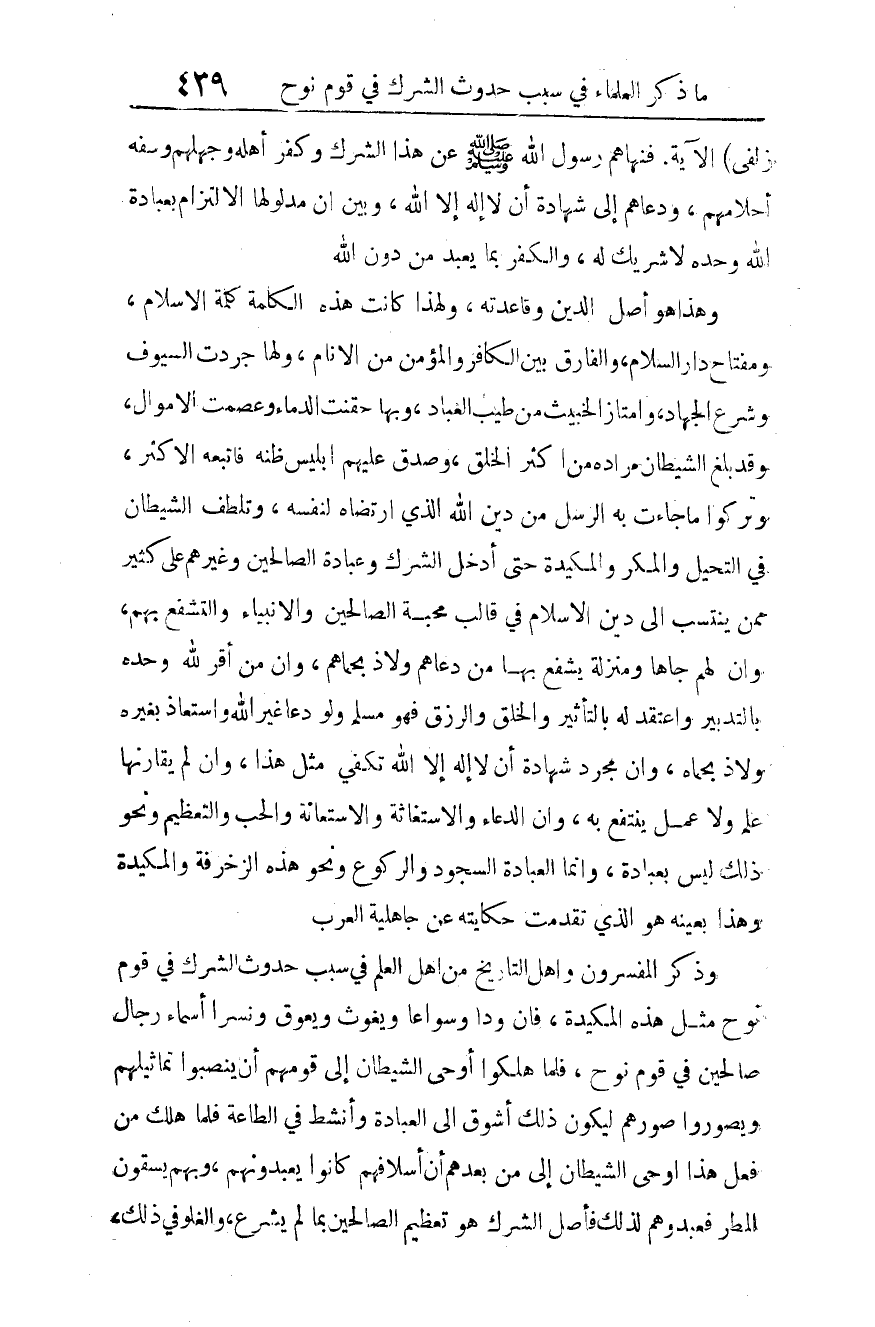 وأن من أقر لله وحده بالتدبير، واعتقد له بالتأثير والخلق والرزق فهو مسلم، ولو دعا غير الله، واستعاذ بغيره ولاذ بحماه، وأن مجرد شهادة أن لا إله إلا الله تكفي مثل هذا، وإن لم يقارنها علم ولا عمل ينتفع به، وأن الدعاء والاستغاثة والاستعانة والحب والتعظيم ونحو ذلك ليس بعبادة، وإنما العبادة السجود والركوع، ونحو هذه الزخرفة والمكيدة، وهذا بعينه هو الذي تقدمت حكايته عن جاهلية العرب.