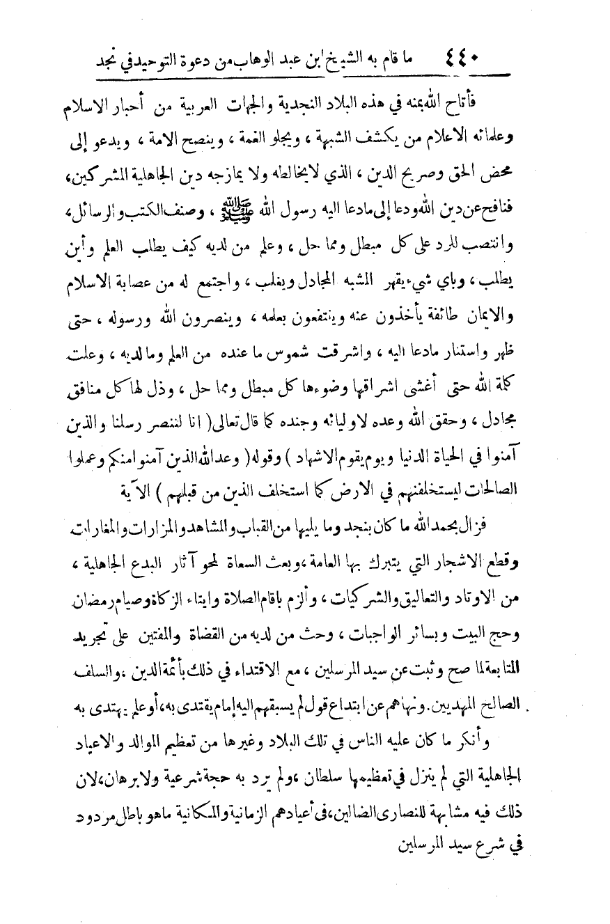 فأتاح الله بمنه في هذه البلاد النجدية والجهات العربية من أحبار الإسلام وعلمائه الأعلام من يكشف الشبهة، ويجلو الغمة، وينصح الأمة، ويدعو إلى محض الحق وصريح الدين، الذي لا يخالطه ولا يمازجه دين الجاهلية المشركين، فنافح عن دين الله، ودعا إلى ما دعا إليه رسول الله صلى الله عليه وسلم وصنف الكتب والرسائل، وانتصب للرد على كل مبطل ومماحل، وعلم من لديه كيف يطلب العلم وأين يطلب، وبأي شيء يقهر المشبه المجادل ويغلب.