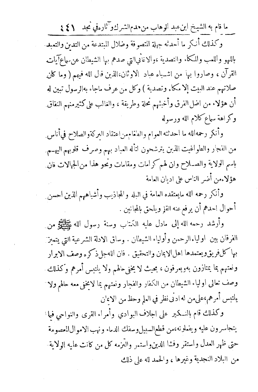 وكذلك قام بالنكير على أجلاف البوادي، وأمراء القرى والنواحي، فيما يتجاسرون عليه ويفعلونه من قطع السبيل، وسفك الدماء، ونهب الأموال المعصومة، حتى ظهر العدل واستقر، وفشا الدين واستمر، والتزمه كل من كانت عليه الولاية من البلاد النجدية وغيرها، والحمد لله على ذلك.