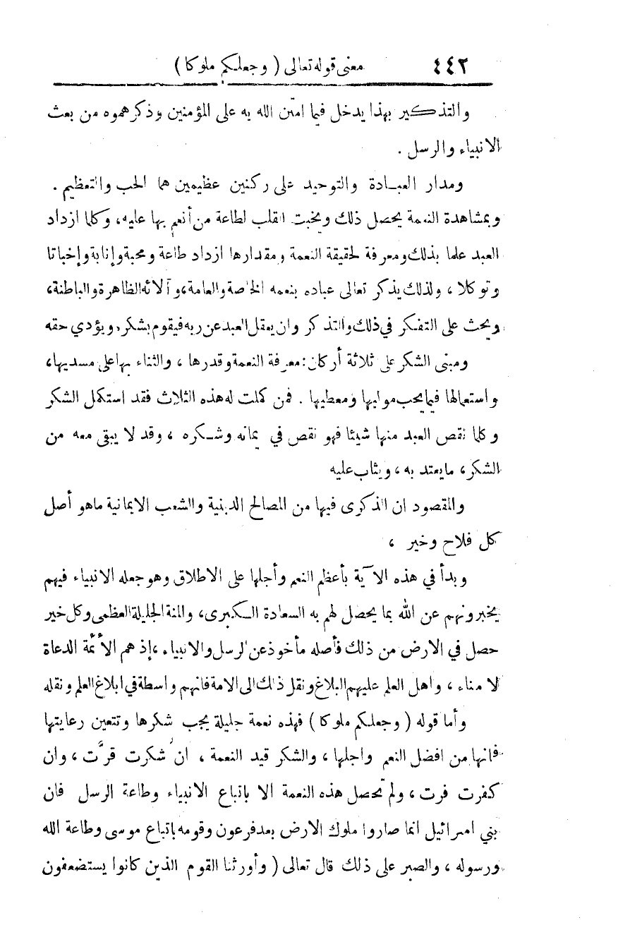 وأما قوله: {وَجَعَلَكُمْ مُلُوكًا} 1 فهذه نعمة جليلة يجب شكرها، وتتعين رعايتها؛ فإنها من أفضل النعم وأجلها. والشكر قيد النعمة، إن شكرت قرت، وإن كفرت فرت. ولم تحصل هذه النعمة إلا باتباع الأنبياء وطاعة الرسل، فإن بني إسرائيل إنما صاروا ملوك الأرض بعد فرعون وقومه باتباع موسى، وطاعة الله ورسوله والصبر على ذلك، قال تعالى: {وَأَوْرَثْنَا الْقَوْمَ الَّذِينَ كَانُوا يُسْتَضْعَفُونَ
