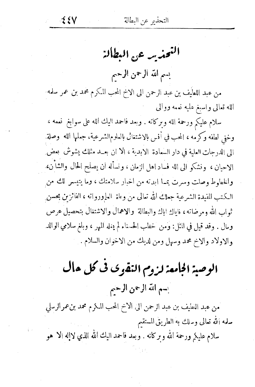 من عبد اللطيف بن عبد الرحمن إلى الأخ المحب المكرم محمد بن عمر سلمه الله تعالى، وأسبغ عليه نعمه ووالى.