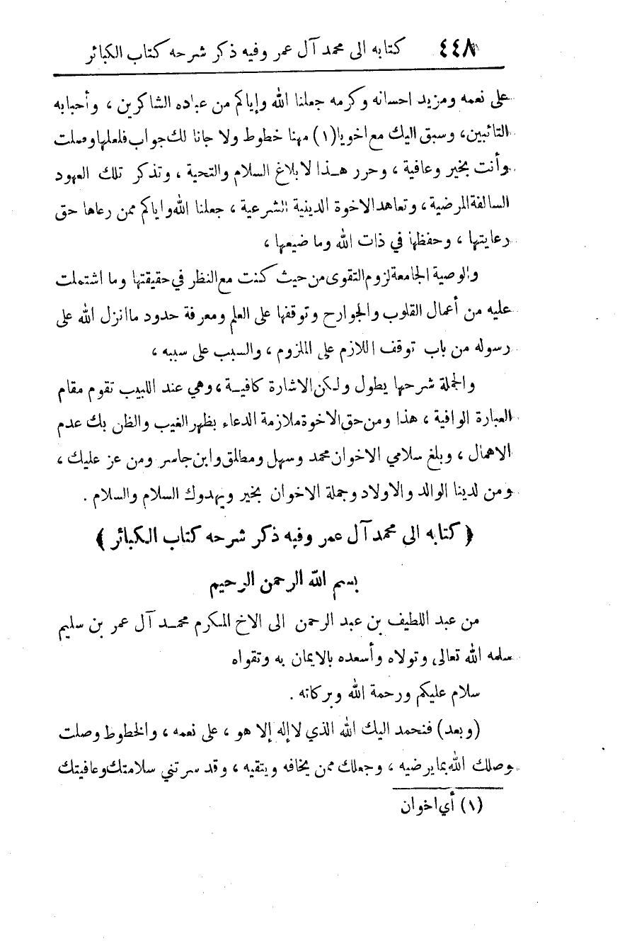 من عبد اللطيف بن عبد الرحمن إلى الأخ المكرم محمد آل عمر بن سليم، سلمه الله تعالى وتولاه، وأسعده بالإيمان به وتقواه.