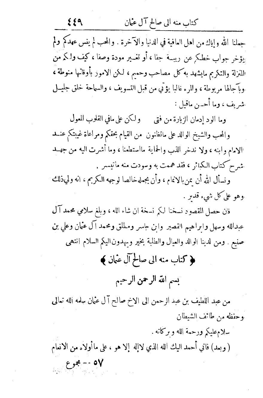 من عبد اللطيف بن عبد الرحمن إلى الأخ صالح آل عثمان، سلمه الله تعالى وحفظه من طائف الشيطان.