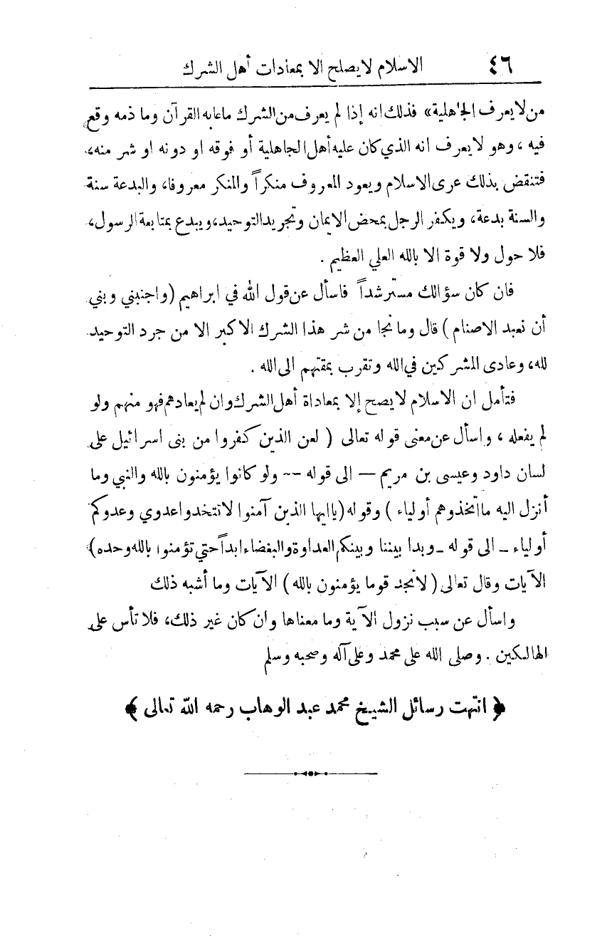 فتأمل أن الإسلام لا يصح إلا بمعاداة أهل الشرك، وإن لم يعادهم فهو منهم ولو لم يفعله، واسأل عن معنى قوله تعالى: {لُعِنَ الَّذِينَ كَفَرُوا مِنْ بَنِي إِسْرائيلَ عَلَى لِسَانِ دَاوُدَ وَعِيسَى ابْنِ مَرْيَمَ} 2 إلى قوله: {وَلَوْ كَانُوا يُؤْمِنُونَ بِاللَّهِ وَالنَّبِيِّ وَمَا أُنْزِلَ إِلَيْهِ مَا اتَّخَذُوهُمْ أَوْلِيَاءَ} 3، وقوله: {يَا أَيُّهَا الَّذِينَ آمَنُوا لا تَتَّخِذُوا عَدُوِّي وَعَدُوَّكُمْ أَوْلِيَاءَ} 4 إلى قوله: {وَبَدَا بَيْنَنَا وَبَيْنَكُمُ الْعَدَاوَةُ وَالْبَغْضَاءُ أَبَدًا حَتَّى تُؤْمِنُوا بِاللَّهِ وَحْدَهُ} 5 الآيات.