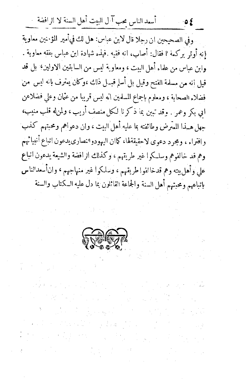 وقد تبين بما ذكرنا لكل منصف أريب، ولمن له قلب منيب، جهل هذا المعترض وطائفته بما عليه أهل البيت، وأن دعواهم ومحبتهم كذب وافتراء، ومجرد دعوى لا حقيقة لها، كما أن اليهود والنصارى يدعون اتباع أنبيائهم، وهم قد خالفوهم وسلكوا غير طريقهم. وكذلك الرافضة والشيعة يدعون اتباع علي وأهل بيته، وهم قد خالفوا طريقهم، وسلكوا غير منهاجهم، وأن أسعد الناس باتباعهم ومحبتهم أهل السنة والجماعة القائلون بما دل عليه الكتاب والسنة.