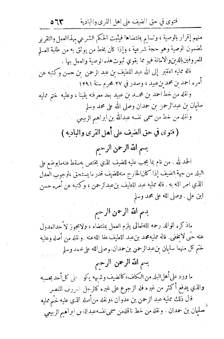 قاله ممليه الفقير إلى الله عبد اللطيف بن عبد الرحمن بن حسن، وكتبه عن أمره أحمد بن محمد بن عبيد، وصدر في 27 محرم سنة 1291.