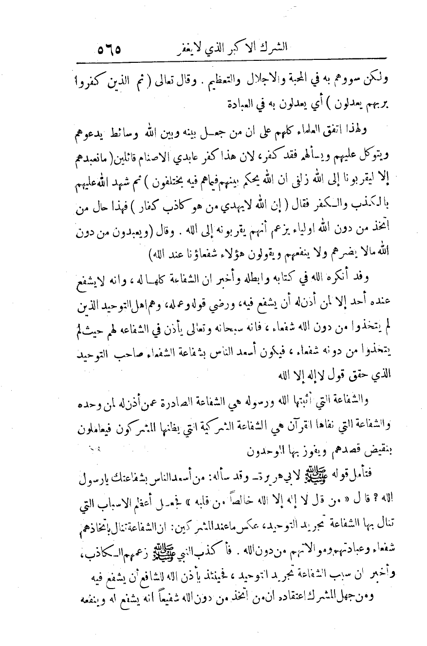 فتأمل قوله صلى الله عليه وسلم لأبي هريرة - وقد سأله: من أسعد الناس بشفاعتك يا رسول الله؟ قال: "من قال: "لا إله إلا الله" خالصا من قلبه"5 فجعل أعظم الأسباب التي تنال بها الشفاعة تجريد التوحيد، عكس ما عند المشركين: أن الشفاعة تنال باتخاذهم شفعاء، وعبادتهم وموالاتهم من دون الله. فأكذب النبي -صلى الله عليه وسلم- زعمهم الكاذب، وأخبر أن سبب الشفاعة تجريد التوحيد، فحينئذ يأذن الله للشافع أن يشفع فيه.