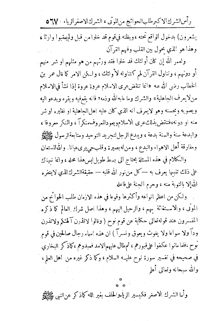 ولكن من أعظم أنواعه، وأكثرها وقوعا في هذه الأزمان طلب الحوائج من الموتى، والاستغاثة بهم، والرحيل إليهم. وهذا أصل شرك العالم كما ذكره المفسرون عند قوله -تعالى- حكاية عن قوم نوح: {وَقَالُوا لا تَذَرُنَّ آلِهَتَكُمْ وَلا تَذَرُنَّ وَدًّا وَلا سُوَاعًا وَلا يَغُوثَ وَيَعُوقَ وَنَسْرًا} 1 إن هذه أسماء رجال صالحين في قوم نوح، فلما ماتوا عكفوا على قبورهم، ثم طال عليهم الأمد فعبدوهم، كما ذكر البخاري في صحيحه في تفسير سورة نوح -عليه السلام-، وكما ذكر غيره من أهل العلم، والله -سبحانه وتعالى- أعلم.