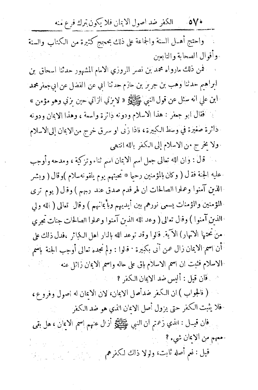 فقال أبو جعفر: هذا الإسلام ودونه دائرة واسعة، وهذا الإيمان ودونه دائرة صغيرة في وسط الكبيرة، فإذا زنى أو سرق خرج من الإيمان إلى الإسلام، ولا يخرج من الإسلام إلى الكفر بالله. انتهى.
