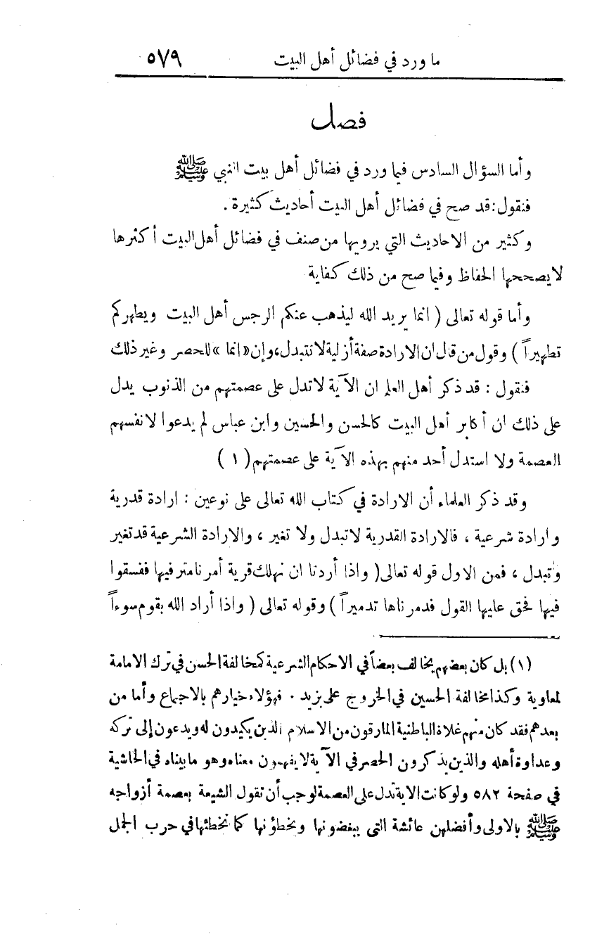 2 بل كان بعضهم يخالف بعضًا في الأحكام الشرعية كمخالفة الحسن في ترك الإمامة لمعاوية، وكذا مخالفة الحسين في الخروج على يزيد. فهؤلاء خيارهم بالإجماع، وأما من بعدهم فقد كان منهم غلاة الباطنية المارقون من الإسلام، الذين يكيدون له ويدعون إلى تركه وعداوة أهله، والذين يذكرون الحصر في الآية لا يفهمون معناه، وهو ما بيناه في الحاشية في صفحة 582، ولو كانت الآية تدل على العصمة لوجب أن تقول الشيعة بعصمة أزواجه -صلى الله عليه وسلم- بالأولى، وأفضلهن عائشة التي يبغضونها، ويخطئونها كما نخطئها في حرب الجمل.