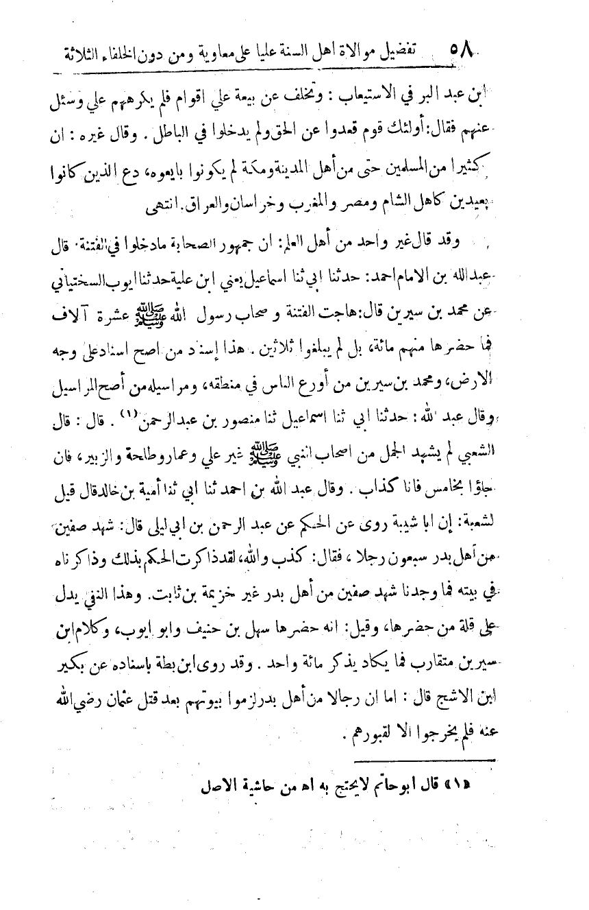 وقد قال غير واحد من أهل العلم: إن جمهور الصحابة ما دخلوا في الفتنة، قال عبد الله بن الإمام أحمد: حدثنا أبي ثنا إسماعيل، يعني ابن علية، حدثنا أيوب السختياني عن محمد بن سيرين قال: هاجت الفتنة، وأصحاب رسول الله صلى الله عليه وسلم عشرة آلاف، فما حضرها منهم مائة، بل لم يبلغوا ثلاثين. هذا إسناد من أصح إسناد على وجه الأرض، ومحمد بن سيرين من أورع الناس في منطقه، ومراسيله من أصح المراسيل.