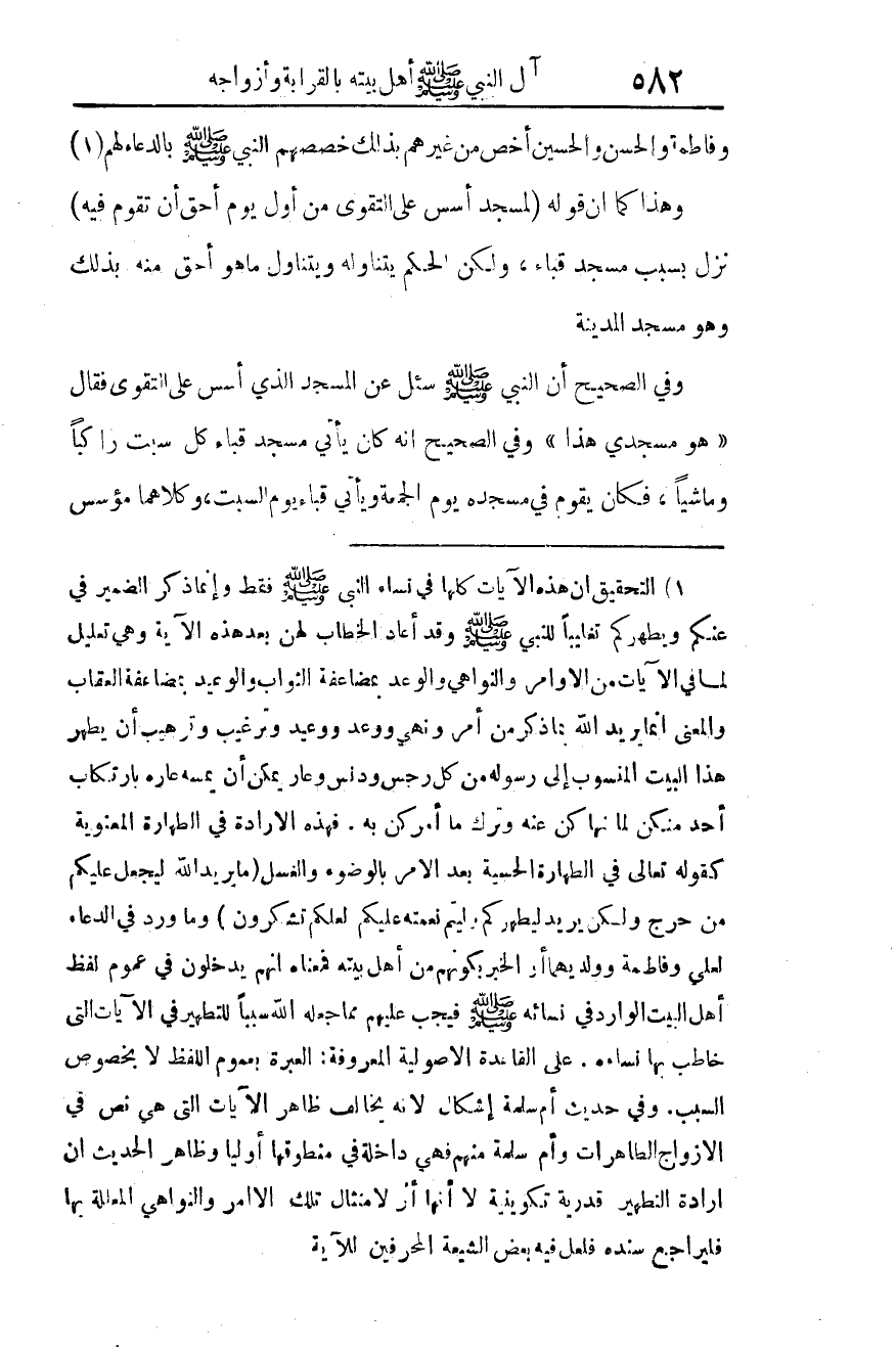 1 التحقيق أن هذه الآيات كلها في نساء النبي -صلى الله عليه وسلم- فقط، وإنما ذكر الضمير في "عنكم"، "ويطهركم" تغليبا للنبي -صلى الله عليه وسلم-، وقد أعاد الخطاب لهن بعد هذه الآية، وهي تعليل لما في الآيات من الأوامر والنواهي، والوعد بمضاعفة الثواب، والوعيد بمضاعفة العقاب. والمعنى: إنما يريد الله بما ذكر من أمر ونهي ووعد ووعيد وترغيب وترهيب؛ أن يطهر هذا البيت المنسوب إلى رسوله من كل رجس، ودنس، وعار يمكن أن يمسه عاره بارتكاب أحد منكن لما نهاكن عنه، وترك ما أمركن به. فهذه الإرادة في الطهارة المعنوية كقوله تعالى في الطهارة الحسية بعد الأمر بالوضوء والغسل: {ما يريد الله ليجعل عليكم من حرج ولكن يريد ليطهركم وليتم نعمته عليكم لعلكم تشكرون} وما ورد في الدعاء لعلي وفاطمة وولديهما، أو الخبر بكونهم من أهل بيته؛ فمعناه أنهم يدخلون في عموم لفظ أهل البيت الوارد في نسائه -صلى الله عليه وسلم- فيجب عليهم مما جعله الله سببا للتطهير في الآيات التي خاطب بها نساءه، على القاعدة الأصولية المعروفة: العبرة بعموم اللفظ لا بخصوص السبب. وفي حديث أم سلمة إشكال؛ لأنه يخالف ظاهر الآيات التي هي نص في الأزواج الطاهرات، وأم سلمة منهم، فهي داخلة في منطوقها أوليا، وظاهر الحديث أن إرادة التطهير قدرية تكوينية لا أنها أثر لامتثال تلك الأوامر والنواهي المعللة بها، فليراجع سنده، فلعل فيه بعض الشيعة المحرفين للآية.