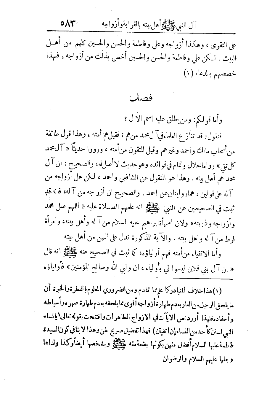 فنقول: قد تنازع العلماء في آل محمد من هم؟ فقيل: هم أمته. وهذا قول طائفة من أصحاب مالك وأحمد وغيرهم، وقيل: المتقون من أمته. ورووا حديثا: "آل محمد كل تقي" رواه الخلال، وتمام في فوائده، وهو حديث لا أصل له. والصحيح: أن آل محمد هم أهل بيته. وهذا هو المنقول عن الشافعي وأحمد، لكن هل أزواجه من آله؟ على قولين، هما روايتان عن أحمد. والصحيح أن أزواجه من آله، فإنه قد ثبت في الصحيحين عن النبي -صلى الله عليه وسلم - أنه علمهم الصلاة عليه: "اللهم صل على محمد وأزواجه وذريته"2 ولأن امرأة إبراهيم -عليه السلام- من آله وأهل بيته، وامرأة لوط من آله وأهل بيته. والآية المذكورة تدل على أنهن من أهل بيته.