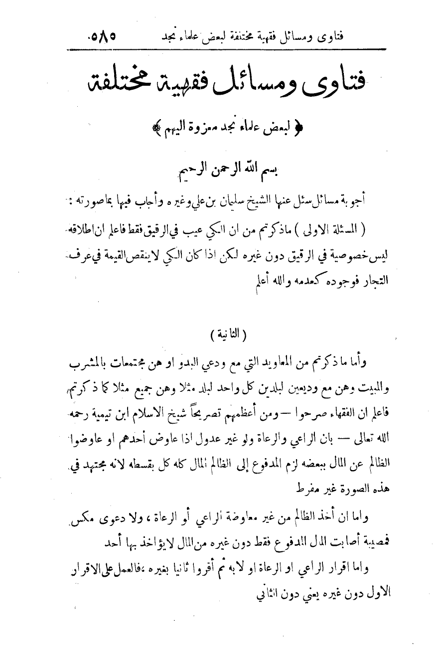أجوبة مسائل سئل عنها الشيخ سليمان بن علي وغيره، وأجاب فيها بما صورته:
