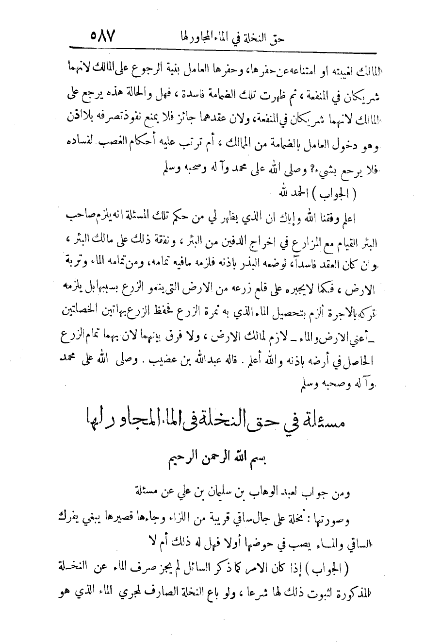 "الجواب" إذا كان الأمر كما ذكر السائل لم يجز صرف الماء عن النخلة المذكورة لثبوت ذلك لها شرعا، ولو باع النخلة الصارف لمجري الماء الذي هو