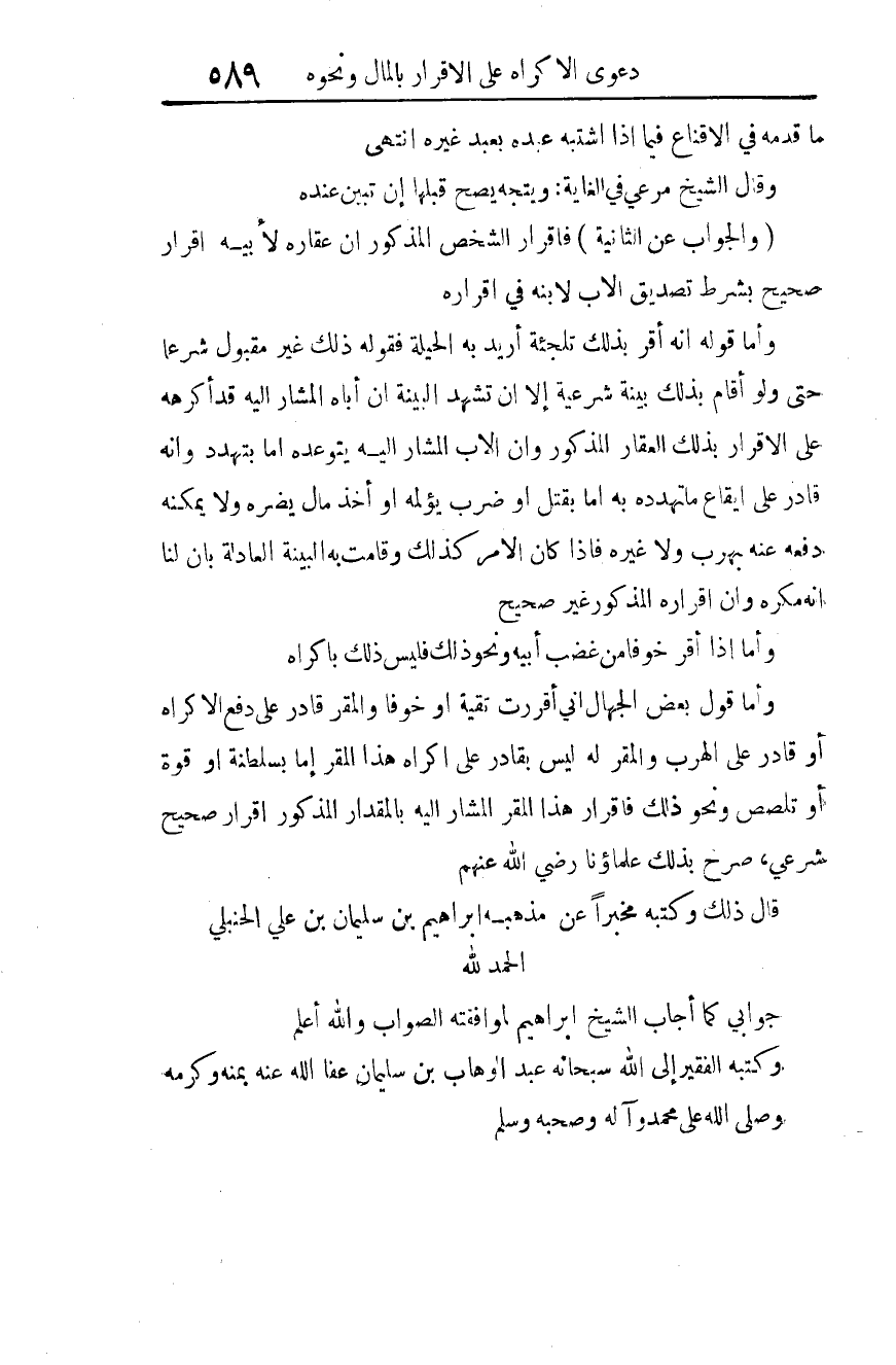 قال ذلك وكتبه مخبرًا عن مذهبه إبراهيم بن سليمان بن علي الحنبلي.