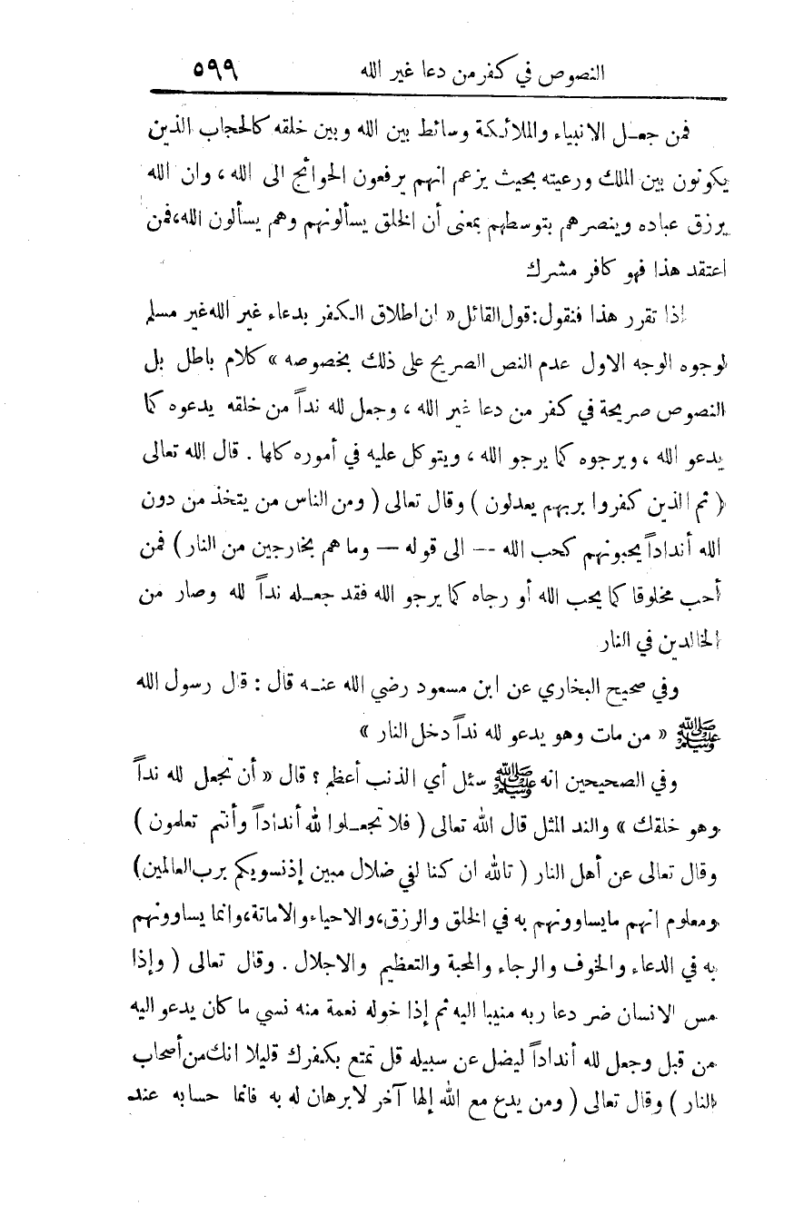 إذا تقرر هذا فنقول: قول القائل: "إن إطلاق الكفر بدعاء غير الله غير مسلم لوجوه: الوجه الأول: عدم النص الصريح على ذلك بخصوصه". كلام باطل، بل النصوص صريحة في كفر من دعا غير الله، وجعل لله ندا من خلقه يدعوه كما يدعو الله، ويرجوه كما يرجو الله، ويتوكل عليه في أموره كلها. قال الله تعالى: {ثُمَّ الَّذِينَ كَفَرُوا بِرَبِّهِمْ يَعْدِلُونَ} 1 وقال تعالى: {وَمِنَ النَّاسِ مَنْ يَتَّخِذُ مِنْ دُونِ اللَّهِ أَنْدَادًا يُحِبُّونَهُمْ كَحُبِّ اللَّهِ} 2 إلى قوله: {وَمَا هُمْ بِخَارِجِينَ مِنَ النَّارِ} 3 فمن أحب مخلوقا كما يحب الله، أو رجاه كما يرجو الله؛ فقد جعله ندا لله، وصار من الخالدين في النار.