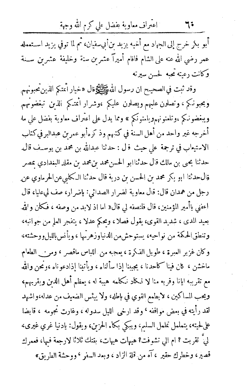 وقد ثبت في الصحيح أن رسول الله صلى الله عليه وسلم قال: "خيار أئمتكم الذين تحبونهم ويحبونكم، وتصلون عليهم ويصلون عليكم، وشرار أئمتكم الذين تبغضونهم ويبغضونكم، وتلعنونهم ويلعنونكم"1. ومما يدل على اعتراف معاوية بفضل علي ما أخرجه غير واحد من أهل السنة في كتبهم، وذكره أبو عمر بن عبد البر في كتاب "الاستيعاب" في ترجمة علي حيث قال: حدثنا عبد الله بن محمد بن يوسف، قال: حدثنا يحيى بن مالك، قال: حدثنا أبو الحسن محمد بن محمد بن مقلد البغدادي بمصر، قال: حدثنا أبو بكر محمد بن الحسن بن درية، قال: حدثنا الكلبي عن الحرماوي عن رجل من همدان، قال: قال معاوية لضرار الصدائي: يا ضرار، صف لي عليا، قال: اعفني يا أمير المؤمنين، قال: فلتصفه لي، قال: "أما إذ لا بد من وصفه؛ فكان والله بعيد المدى، شديد القوى، يقول فصلا، ويحكم عدلا، يتفجر العلم من جوانبه، وتنطق الحكمة من نواحيه، يستوحش من الدنيا وزهرتها، ويأنس بالليل ووحشته، وكان غزير العبرة، طويل الفكرة، يعجبه من اللباس ما قصر، ومن الطعام ما خشن، كان فينا كأحدنا، يجيبنا إذا سألناه، ويأتينا إذا دعوناه، ونحن والله مع تقريبه إيانا وقربه منا لا نكاد نكلمه هيبة له، يعظم أهل الدين ويقربهم، ويحب المساكين، لا يطمع القوي في باطله، ولا ييئس الضعيف من عدله. وأشهد لقد رأيته في بعض مواقفه، وقد أرخى الليل سدوله، وغارت نجومه، قابضا على لحيته، يتململ تململ السليم، ويبكي بكاء الحزين، ويقول: يا دنيا غري غيرى، إليّ تقرّبت؟ أم إليّ تشوفت؟ هيهات هيهات، بتتك ثلاثا لا رجعة فيها، فعمرك قصير، وخطرك حقير، آه من قلة الزاد، وبعد السفر، ووحشة الطريق! ".