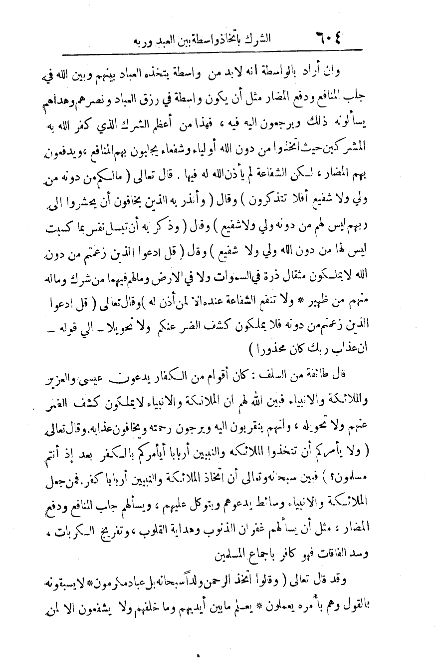 وإن أراد بالواسطة أنه لا بد من واسطة يتخذه العباد بينهم وبين الله في جلب المنافع، ودفع المضار مثل: أن يكون واسطة في رزق العباد ونصرهم وهداهم يسألونه ذلك، ويرجعون إليه فيه، فهذا من أعظم الشرك الذي كَفَّرَ الله به المشركين حيث اتخذوا من دون الله أولياء وشفعاء يجتلبون بهم المنافع، ويدفعون بهم المَضَارّ، لكن الشفاعة لمن يأذن الله له فيها. قال تعالى: {مَا لَكُمْ مِنْ دُونِهِ مِنْ وَلِيٍّ وَلا شَفِيعٍ أَفَلا تَتَذَكَّرُونَ} 1 وقال: {وَأَنْذِرْ بِهِ الَّذِينَ يَخَافُونَ أَنْ يُحْشَرُوا إِلَى رَبِّهِمْ لَيْسَ لَهُمْ مِنْ دُونِهِ وَلِيٌّ وَلا شَفِيعٌ} 2 وقال: {وَذَكِّرْ بِهِ أَنْ تُبْسَلَ نَفْسٌ بِمَا كَسَبَتْ لَيْسَ لَهَا مِنْ دُونِ اللَّهِ وَلِيٌّ وَلا شَفِيعٌ} 3 وقال: {قُلِ ادْعُوا الَّذِينَ زَعَمْتُمْ مِنْ دُونِ اللَّهِ لا يَمْلِكُونَ مِثْقَالَ ذَرَّةٍ فِي السَّمَاوَاتِ وَلا فِي الأَرْضِ وَمَا لَهُمْ فِيهِمَا مِنْ شِرْكٍ وَمَا لَهُ مِنْهُمْ مِنْ ظَهِيرٍ وَلا تَنْفَعُ الشَّفَاعَةُ عِنْدَهُ إِلا لِمَنْ أَذِنَ لَهُ} 4. وقال تعالى: {قُلِ ادْعُوا الَّذِينَ زَعَمْتُمْ مِنْ دُونِهِ فَلا يَمْلِكُونَ كَشْفَ الضُّرِّ عَنْكُمْ وَلا تَحْوِيلًا} 5 إلى قوله: {إِنَّ عَذَابَ رَبِّكَ كَانَ مَحْذُور} 6.