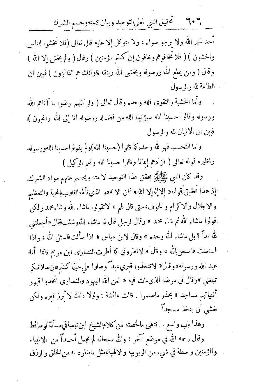 أحدٌ غيرَ الله ولا يرجو سواه، ولا يتوكل إلا عليه قال تعالى: {فَلا تَخْشَوُا النَّاسَ وَاخْشَوْنِ} 1 {فَلا تَخَافُوهُمْ وَخَافُونِ إِنْ كُنْتُمْ مُؤْمِنِينَ} 2 وقال: {وَلَمْ يَخْشَ إِلَّا اللَّهَ} 3 وقال: {مَنْ يُطِعِ اللَّهَ وَرَسُولَهُ وَيَخْشَ اللَّهَ وَيَتَّقْهِ فَأُولَئِكَ هُمُ الْفَائِزُونَ} 4 فبين أن الطاعة لله والرسول.