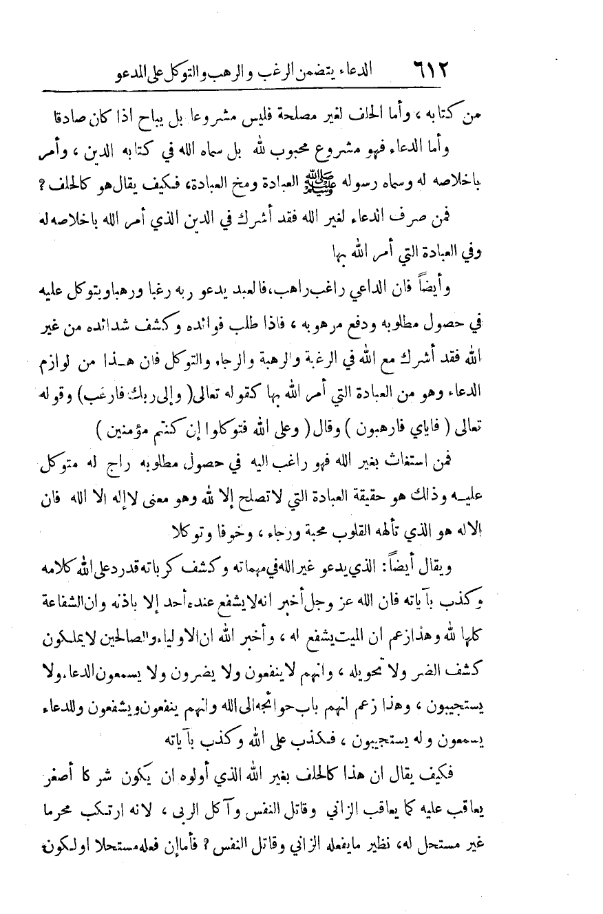 وأيضا فإن الداعي راغبٌ راهبٌ، فالعبد يدعو ربه رغبا ورهبا، ويتوكل عليه في حصول مطلوبه، ودفع مرهوبه، فإذا طلب فوائده، وكَشْفَ شدائده من غير الله فقد أشرك مع الله في الرغبة والرهبة والرجاء والتوكل، فإن هذا من لوازم الدعاء، وهو من العبادة التي أمر الله بها، كقوله تعالى: {وَإِلَى رَبِّكَ فَارْغَبْ} 1 وقوله تعالى: {وَإِيَّايَ فَارْهَبُونِ} 2 وقال: {وَعَلَى اللَّهِ فَتَوَكَّلُوا إِنْ كُنْتُمْ مُؤْمِنِينَ} 3.