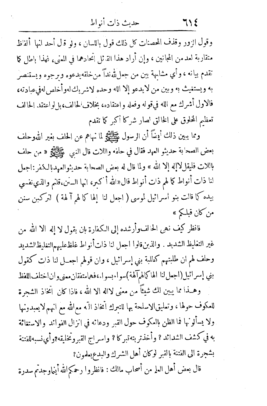 وهذا مما يُبَيِّنُ لك شيئا من معنى لا إله إلا الله، فإذا كان اتخاذ الشجرة للعُكُوف حولها، وتعليق الأسلحة بها للتبرك اتخاذ إله مع الله مع أنهم لا يعبدونها، ولا يسألونها، فما الظن بالعكوف حول القبر ودعائه في إنزال الفوائد، والاستغاثة به في كشف الشدائد؟ وأخذ تربته تبركا؟ وإسراج القبر وتخليقه؟ وأيّ نسبة للفتنة بشجرة إلى الفتنة بالقبر، لو كان أهل الشرك والبدع يعلمون؟